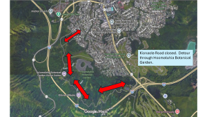 Storm waters have undermined a culvert under Kionaole Road in Kāneohe. This road is about a half mile from Kamehameha Highway and services residents, Pali Golf Course, Koolau Ballrooms and the First Presbyterian Church of Honolulu. During the culvert repairs, the City and County Department of Parks and Recreation has agreed to allow drivers to detour through Hoʻomaluhia Botanical Garden.